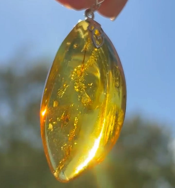 Âmbar. Essa substância brilha que nem pedra preciosa mas não é exatamente um mineral. É uma resina fossilizada de árvores antigas. Eu lembro de quando no inicio dos anos 90, fui ao cinema assistir Jurassic Park. Só quem viveu sabe o que foi ver aquele fime com os dinossauros vivos, caminhando no nosso mundo. Mas algo que sempre me marcou foi a ideia de que tudo aquilo existia por causa de uma resina de árvore que guardava um inseto, que tinha o DNA do dinossauro. Milhões de anos de vida guardados em âmbar. Nunca parei de amar âmbar, ficou pra mim como um portal mágico, mínimo, mas que continha informações de outros tempos.